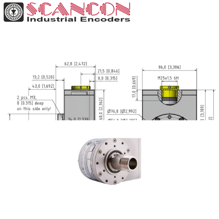 Thông số Giá trị Độ phân giải 1024 PPR Loại tín hiệu Theo cấu hình mã SA-D-04 / DW / EC09 (tín hiệu xung chuẩn công nghiệp) Dạng encoder Theo mã SCH86BEX – encoder hạng nặng, vỏ lớn, cấp bảo vệ cao Cấp bảo vệ IP65 (theo mã DW-65) Vật liệu vỏ Hợp kim công nghiệp – chịu rung và môi trường khắc nghiệt Kiểu kết nối EC09 – đầu nối theo mã của Scancon Ứng dụng Đo tốc độ, giám sát vị trí, điều khiển vòng kín Dạng trục rỗng (Hollow Shaft Ø 8 mm) – dễ dàng lắp đồng trục với motor/ trục quay, không cần khớp nối.
